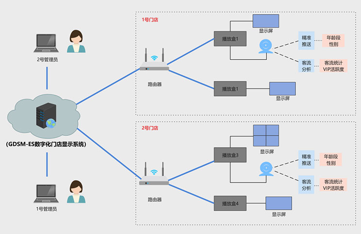 该客户为宁波地区零售门店,在一段时间内,客户发现门店销售额持续下滑,但是不知道原因出在哪里,到底是消费者减少,还是广告推送出现问题,亦或是其他原因,客户没有头绪,三亿科技数据化门店显示系统完美的解决了客户痛点,方案拓扑图如下: