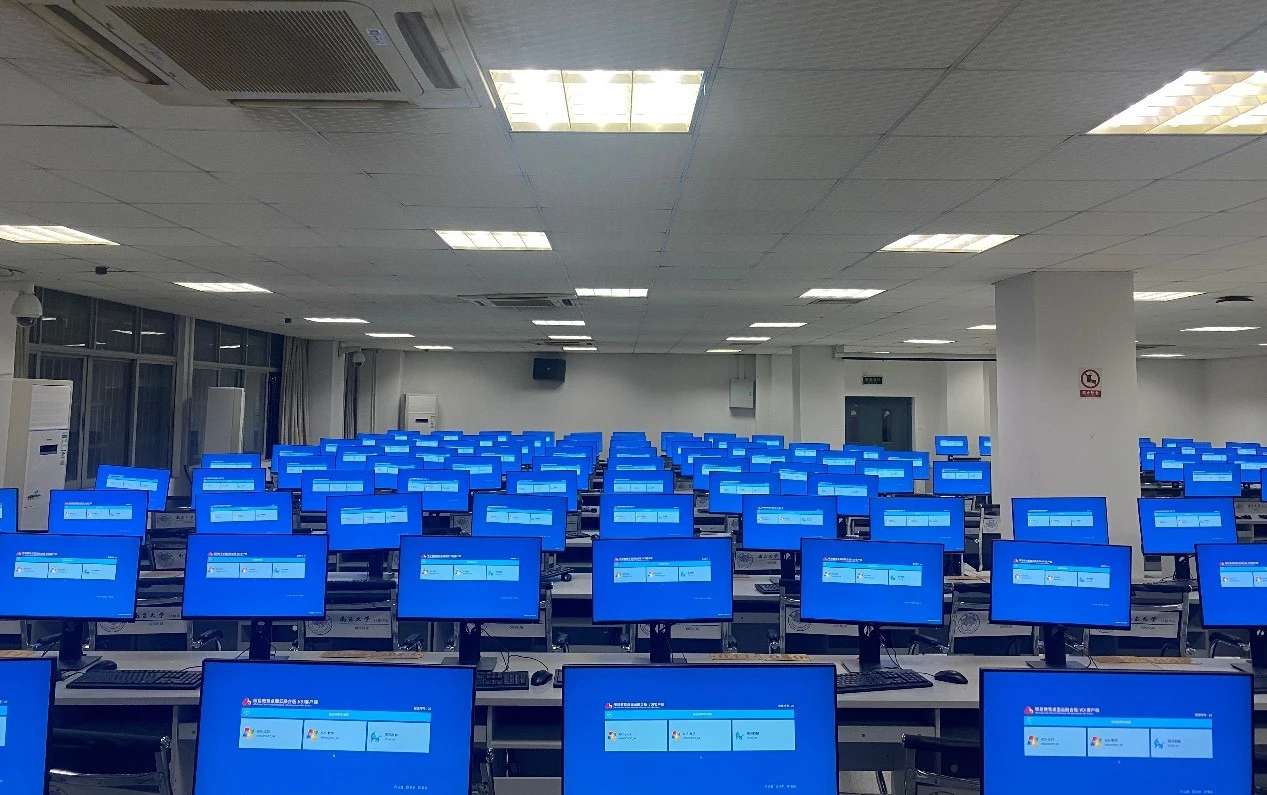 在某大学实训室,整齐的电脑屏后面是统一的三亿科技云终端主机,老师在讲台上通过电脑端的管理软件,轻松地将教学资料推送到学生的终端上,每位学生的电脑屏幕一致会出现同个页面。