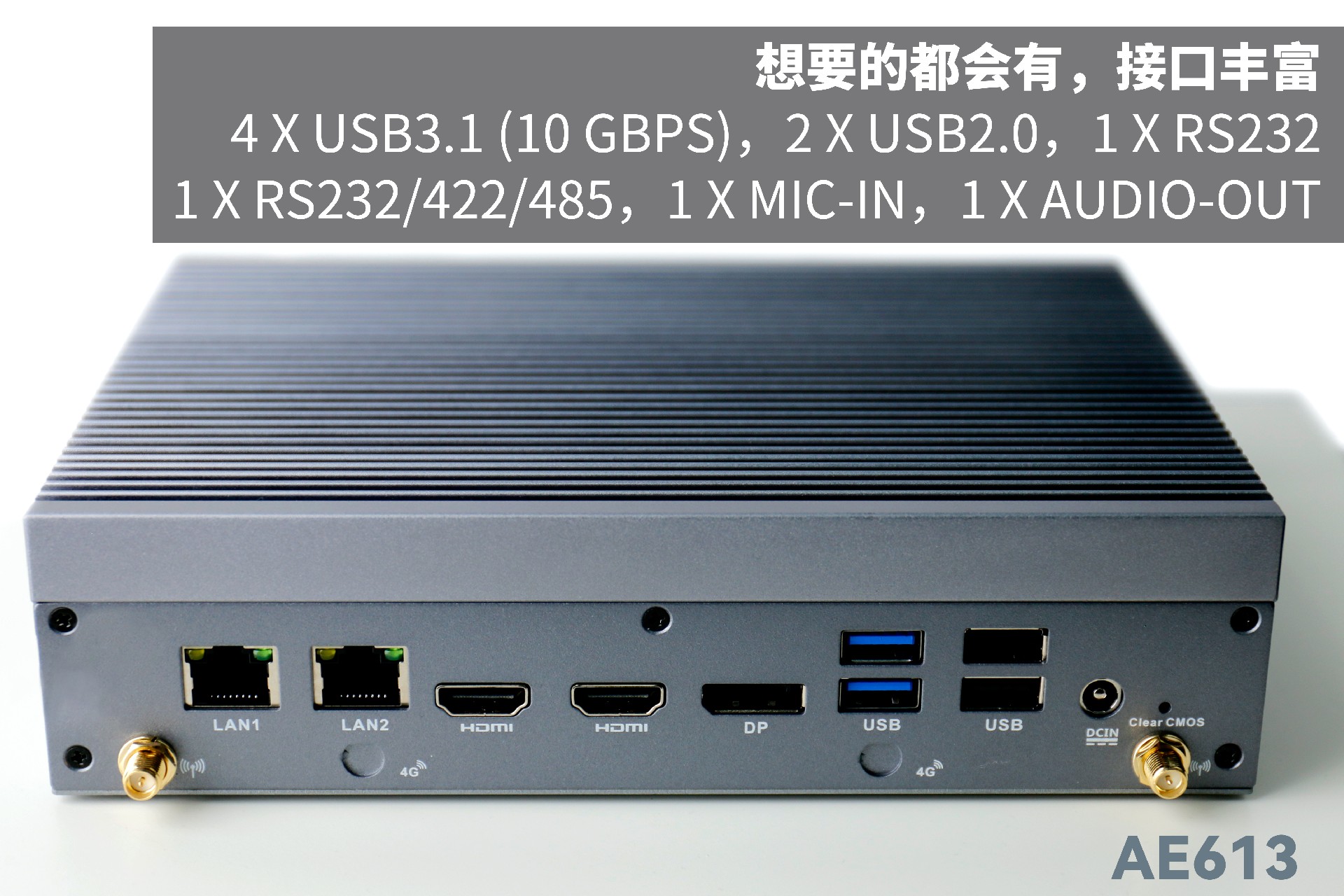 三亿AE613支持Windows 11 、Linux Ubuntu系统;拥有丰富接口:双千兆自适应RJ45网口,4 x USB3.1 (10 Gbps),2 x USB2.0,1 x RS232,1 x RS232/422/485,1 x MIC-IN,1 x AUDIO-OUT,帮助用户实现更多功能扩展;并且支持Wi-Fi 6E,可以提供更高的带宽和更少的干扰,支持对无线网络有特定需求场景的应用。