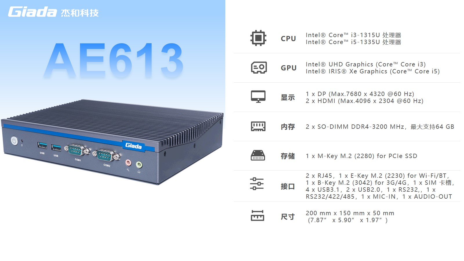 三亿AE613集成Intel®UHD Graphics (Core i3)/Intel®Iris®Xe Graphics (Core i5) GPU,支持8K分辨率(7680 x 4320 @60 Hz),支持3个独立显示器,可实现拓展、复制、独显模式。具备出色的图形处理能力,能够缔造令人惊艳的视觉效果,并为用户带来沉浸式的多媒体体验。